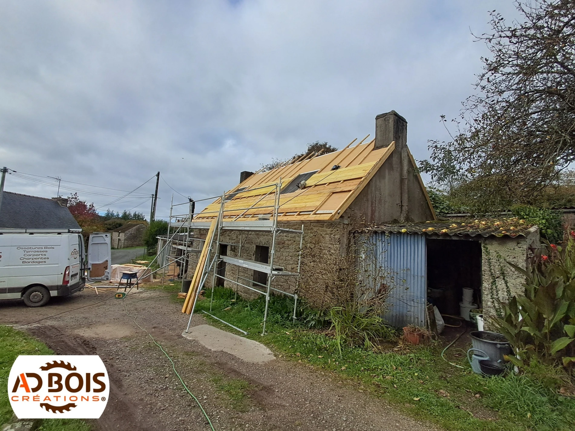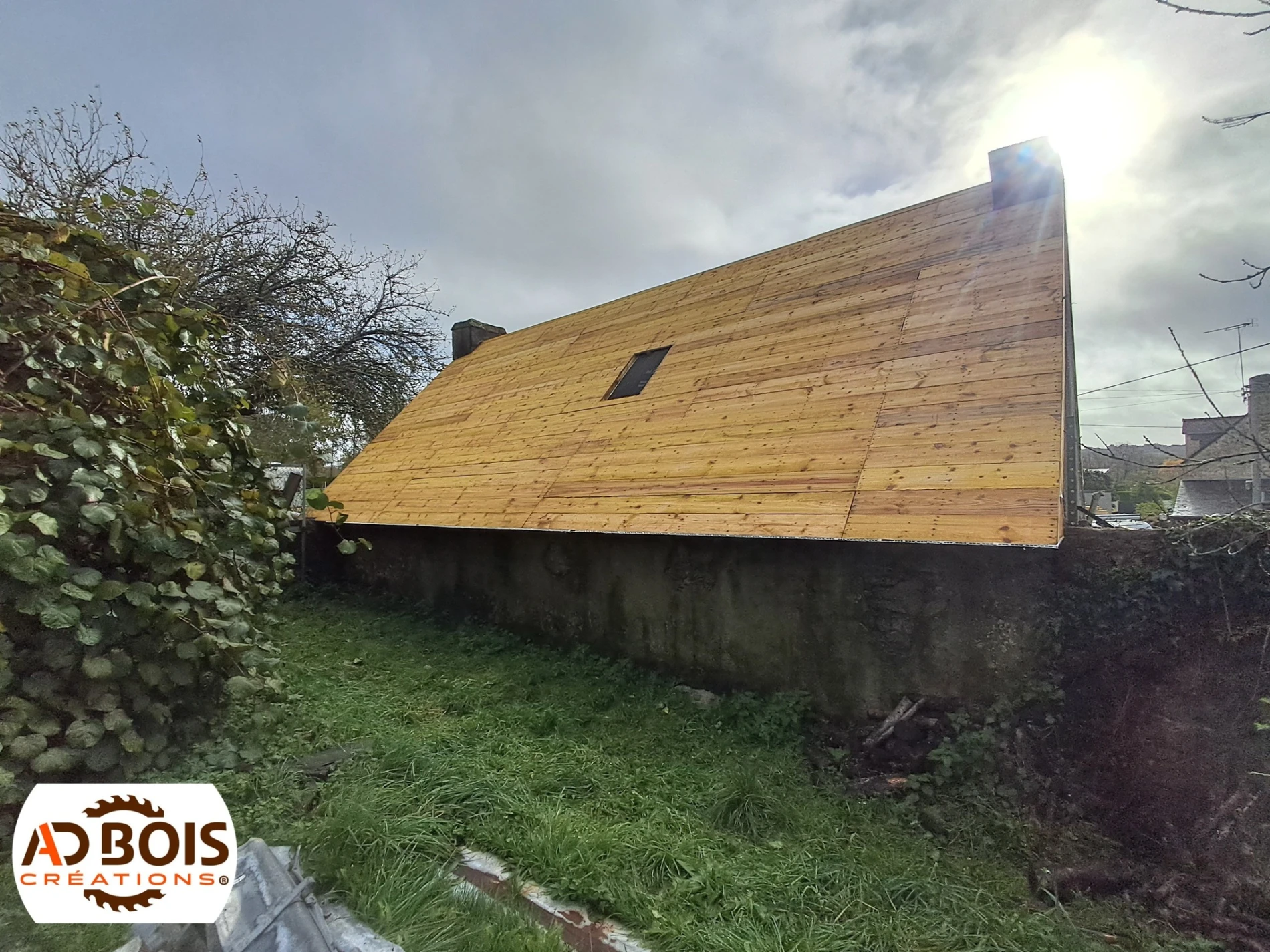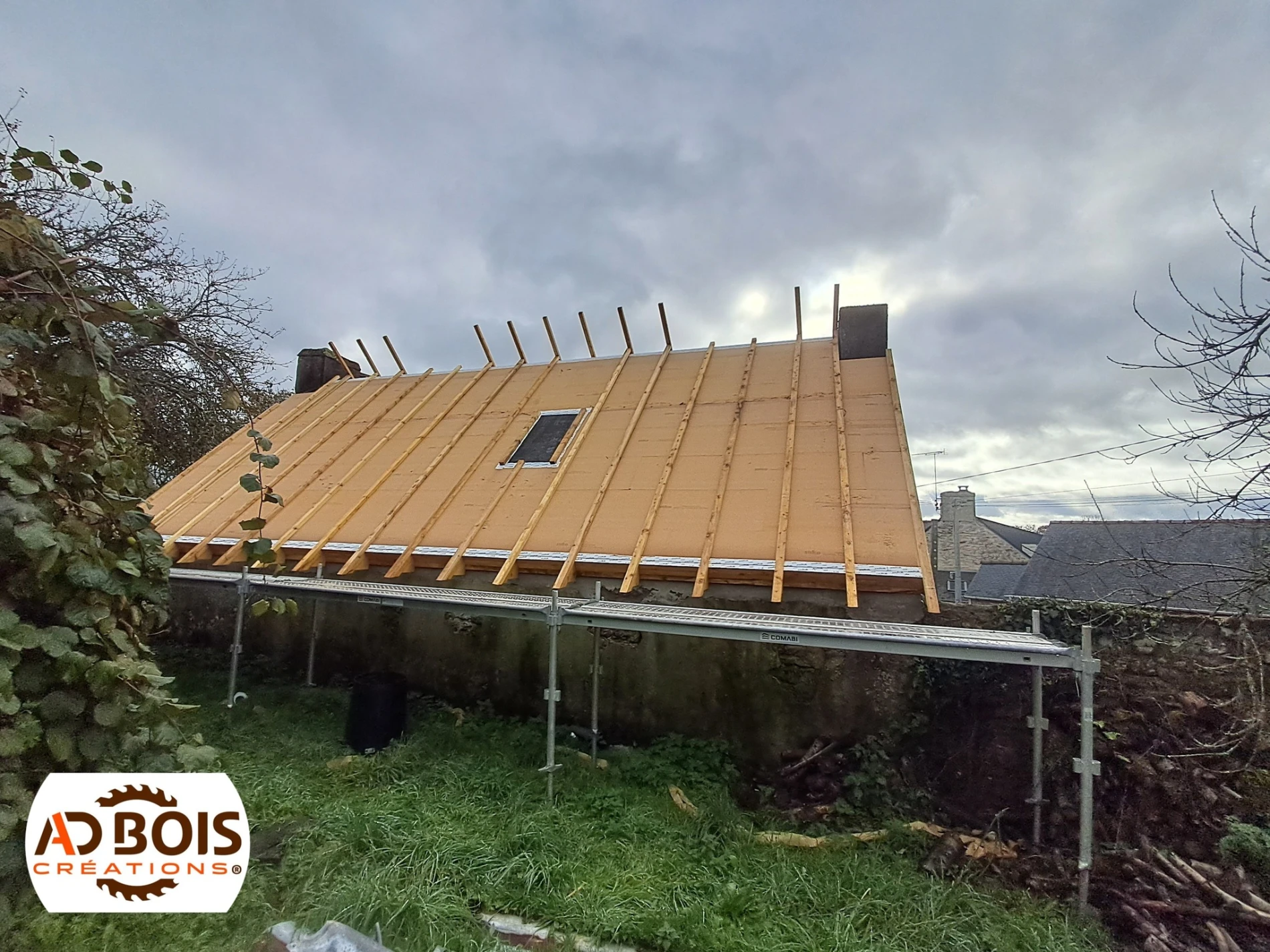 charpente de type fermette, avec une isolation en panneau de fibres de bois steico intégral de 60mm, volige et sous face pvc blanc ventilée